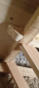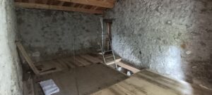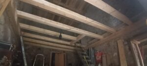 J’ai pu y reprendre mes travaux comme prévu. La toiture ayant été terminée l’an passé, je me suis attaqué au plancher de l’étage qui avait évidemment disparu puisque la maison était en ruine totale lors de l’achat.